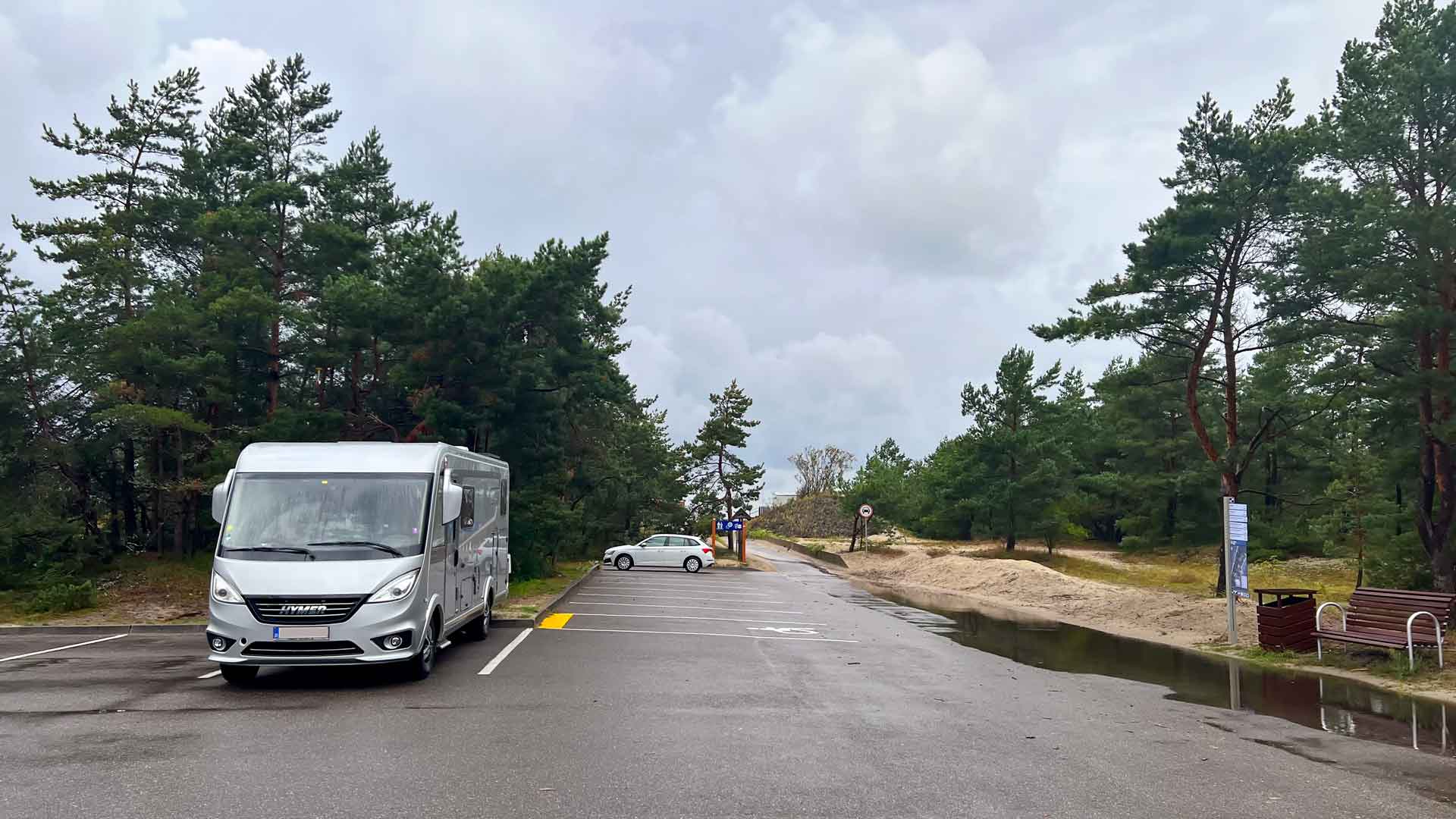 Met de rest van de boodschappen aan boord rijden we verder naar de pont. We kunnen gelijk mee en binnen no time staan we op de Koerse Schoorwal. Ondertussen is het behoorlijk gaan regenen en dat houden we tot we in Neringa een parking hebben gevonden. Daar even snel in de regen met de honden naar buiten en dan maar rustig naar binnen wachten op beter weer.