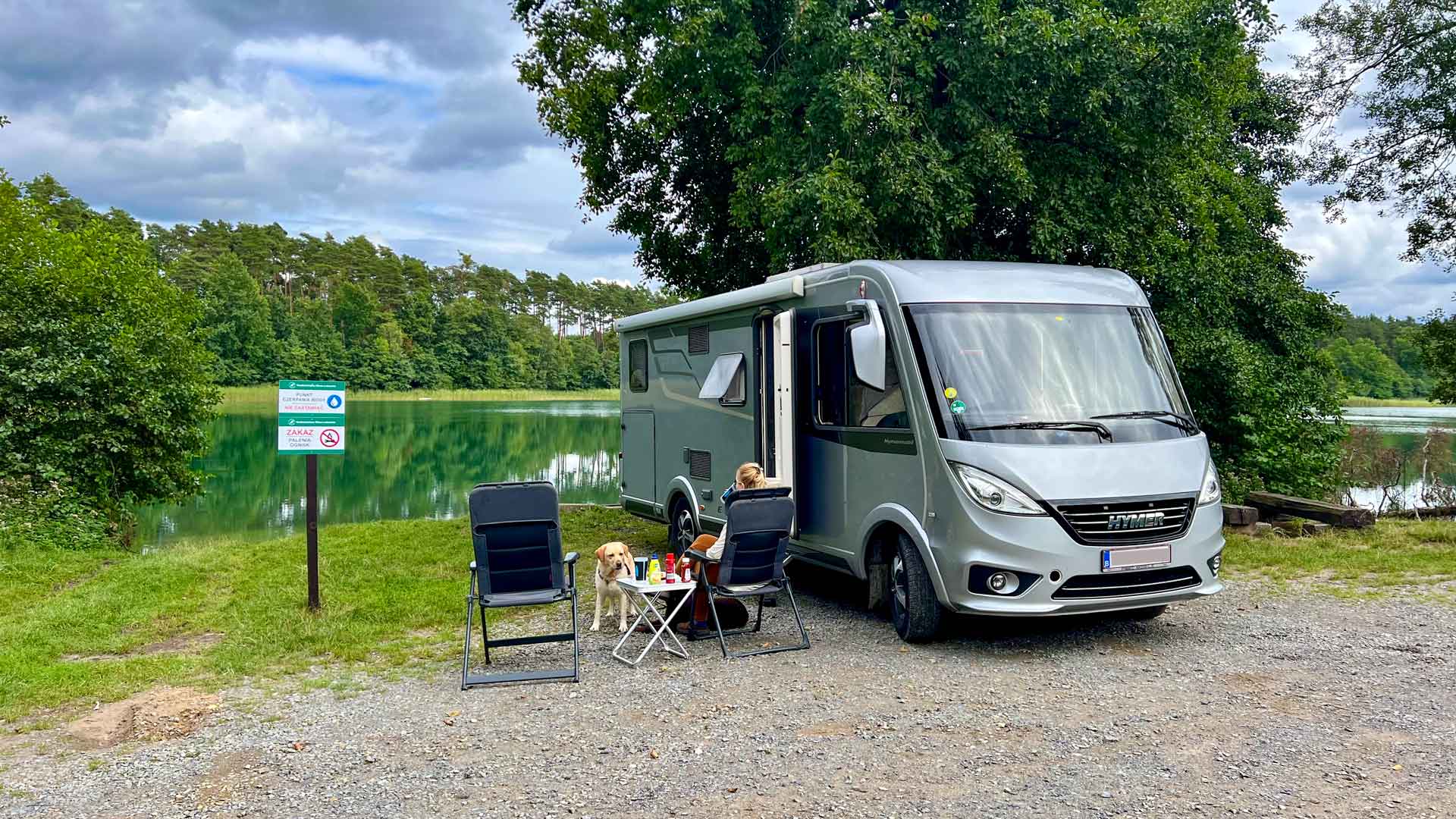 Na een korte rit stoppen we bij het Jezioro Kolejowe meer in de buurt van Ośno Lubuskie. We parkeren mooi aan het meer en maken ons klaar voor een hike rond het meer. Een drie kilometer verder staan we weer bij de mobilhome, Het is wat drukker geworden maar dat is niet verwonderlijk want het zonnetje schijnt heerlijk. We