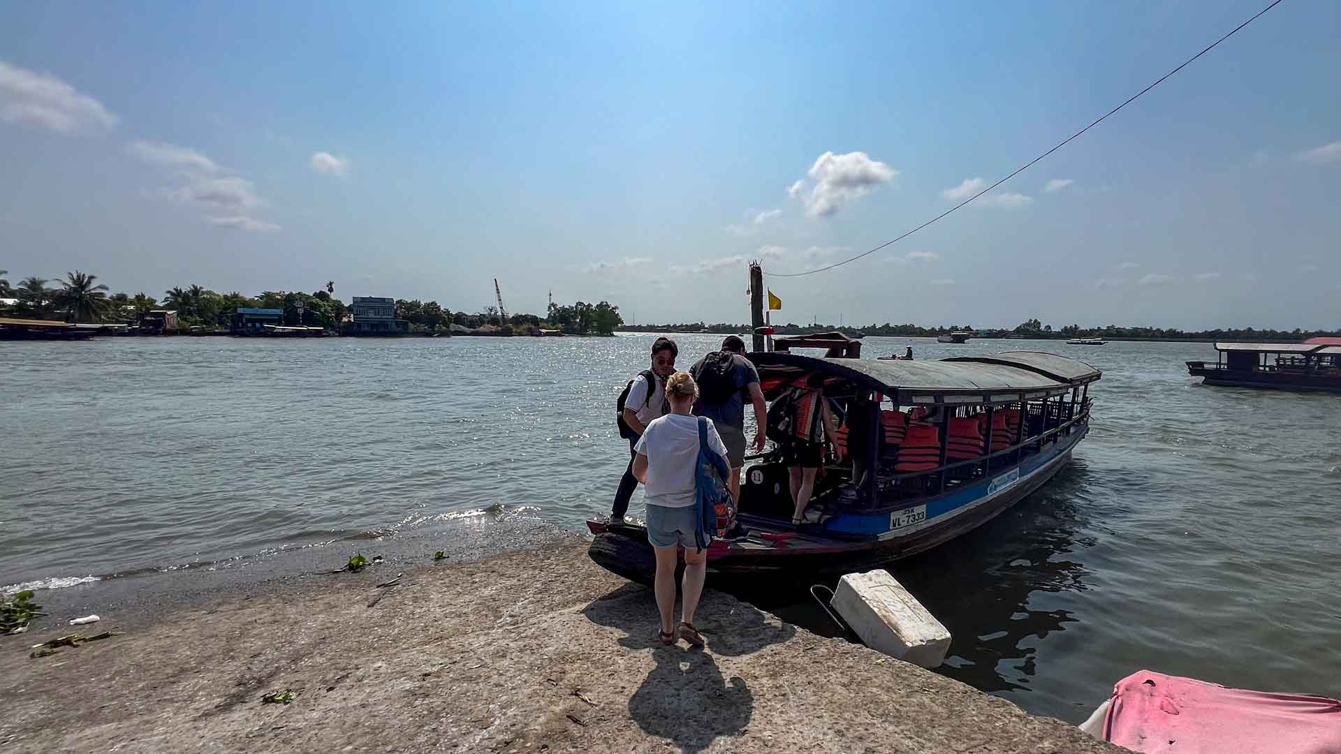 Tijdens de twee en een half uur durende rit naar de haven waar we vertrekken verteld hij honderd uit allemaal boeiende verhalen over verschillende zaken. Als we aankomen bij de haven is het tijd voor de happy room zoals de Vietnamese gidsen het toilet noemen. Dan is het tijd om aan boord te gaan. De koffers blijven in de auto en zullen we later weer terug zien.