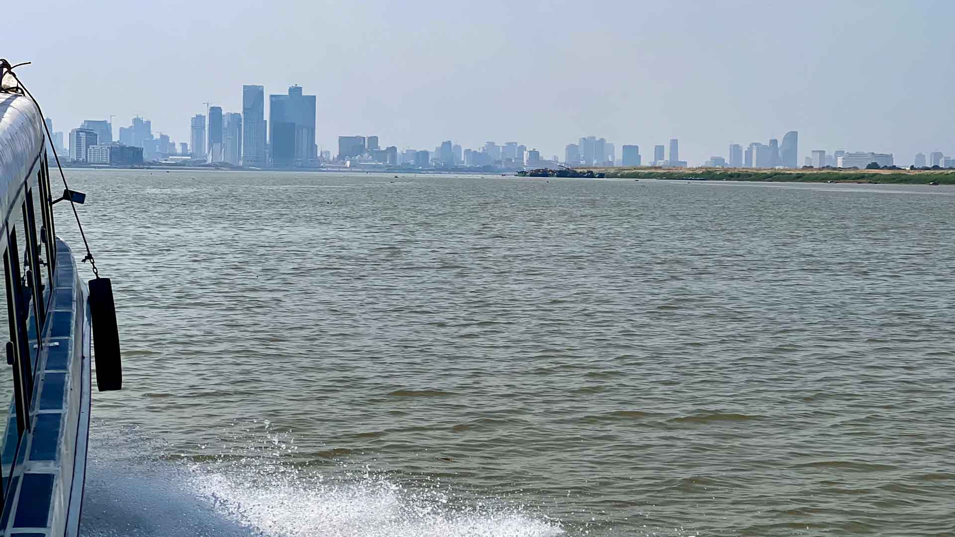 Nadat iedereen zijn visa heeft en de paspoort controle heeft ondergaan kunnen we terug aan boord. De stoelen dans van de eerste stop is weer terug in zijn plooi gevallen en kunnen we vertrekken. Na ruim twee en een half uur varen zien we in de verte de skyline van Phnom Penh opdoemen.