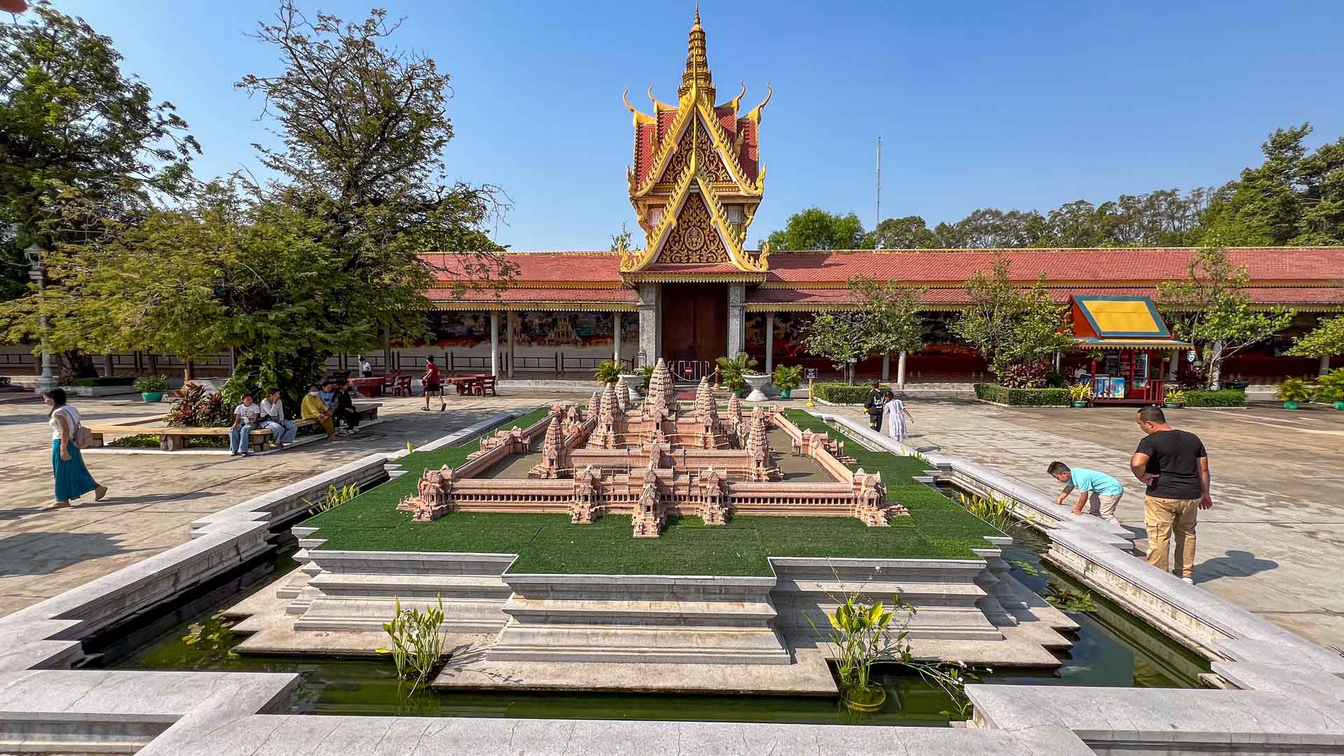 Na ons heftige bezoek aan het genocide museum is het tijd voor wat luchtigers. We gaan naar het Wat Phnom Daun Penh park. Als we aankomen gaat onze gids de kaartjes halen en zien wij eerst een grote vogel en supergrote vleermuizen net buiten het park. Eenmaal naar boven zien we een grote groep mensen van die wierookstokken aansteken en offers brengen aan een Boeddha. Onder een bloedhete zon wandelen we door het park waar we nog verschillende zaken bekijken. Niet echt bijzonder maar wel leuk om te zien.