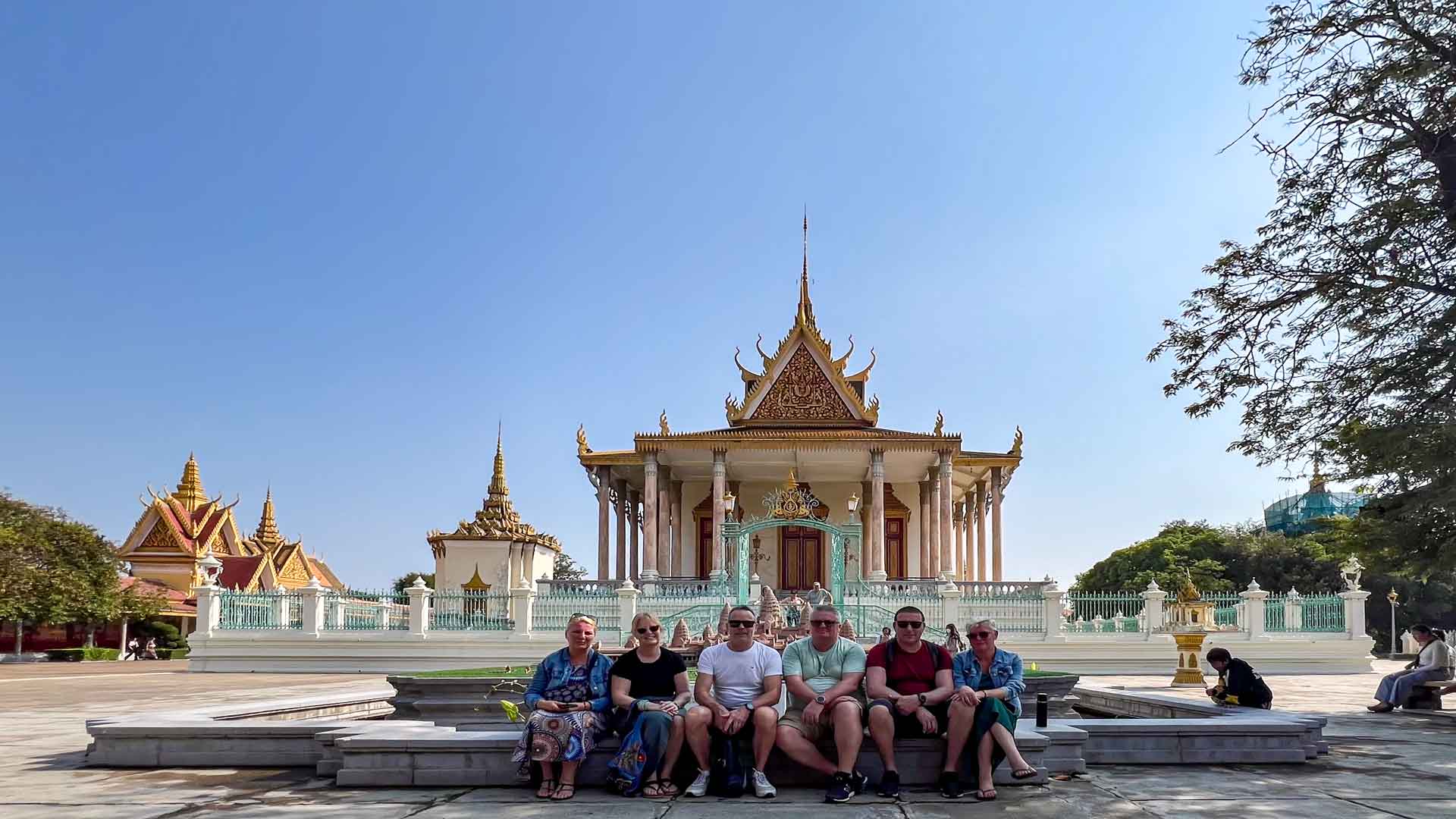 Eenmaal de gids ons heeft gevonden vertrekken we met de bus naar het Royal Palace. Een rit van nog geen vijf minuten want vanuit ons hotel kamer zien we het al liggen. Binnen het paleis, waar de mannen een broek aan moeten tot over hun knieën en de dames bedekte schouders en een rok of broek tot over de knieën, krijgen we een rondleiding van onze gids. We bezoeken de verschillende gebouwen en zien dat de koning thuis is. Tenminste de vlag hangt in top wat betekend dat hij daar is.
