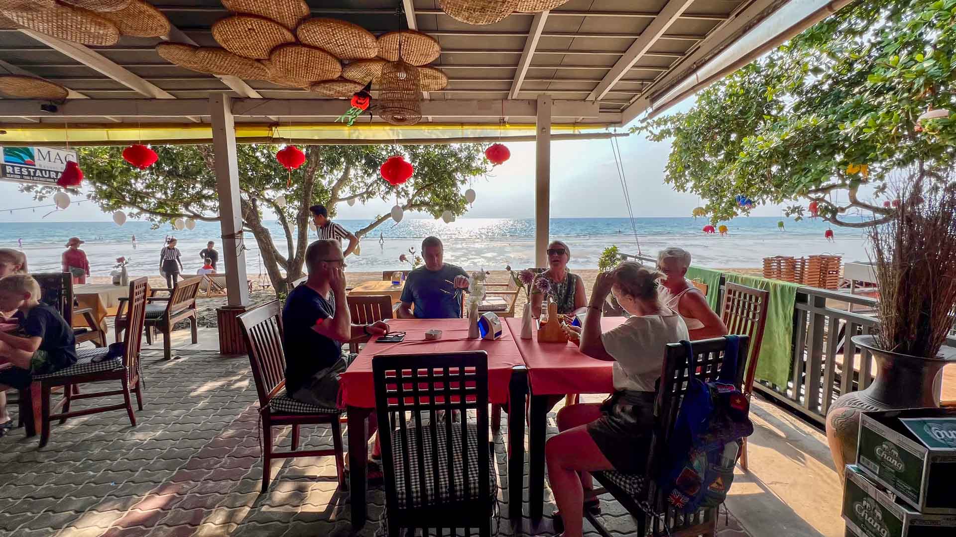 Geen wekker, geen slecht werkende airco, dus alle ingrediënten waren aanwezig voor een heerlijke nacht. Het is dan ook al acht uur voordat we wakker worden. Das al even geleden. Buiten met zicht op zee genieten we van de lunch. Het valt op dat we eigenlijk een uitzondering zijn. Bijna aan elke tafel zit wel een westerling met een Thaise vrouw. In elk mogelijk combinatie. Met gezin, opa met zijn nieuwe Thaise vriendin en zijn westerse kinderen of gewoon alleen.