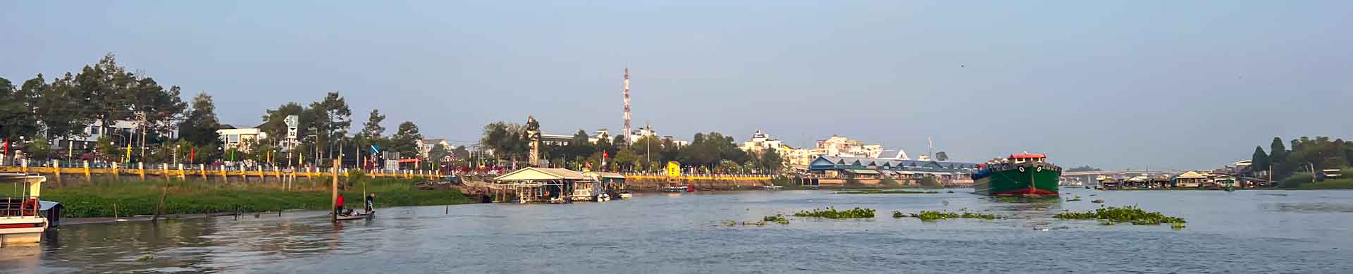 Eenmaal in het busje gaan we op weg naar onze laatste stop in Vietnam, Chau Doc. Na een tocht van weer zo’n kleine twee uur, waarin we meer ambulance’s horen dan heel het verlof tot nu toe, rijden we de grens plaats binnen. De eerste indruk is, dat het maar een vrij saaie plaats is. We zitten in een hotel naast een grote weg. Echt een winkel centrum vinden we niet.