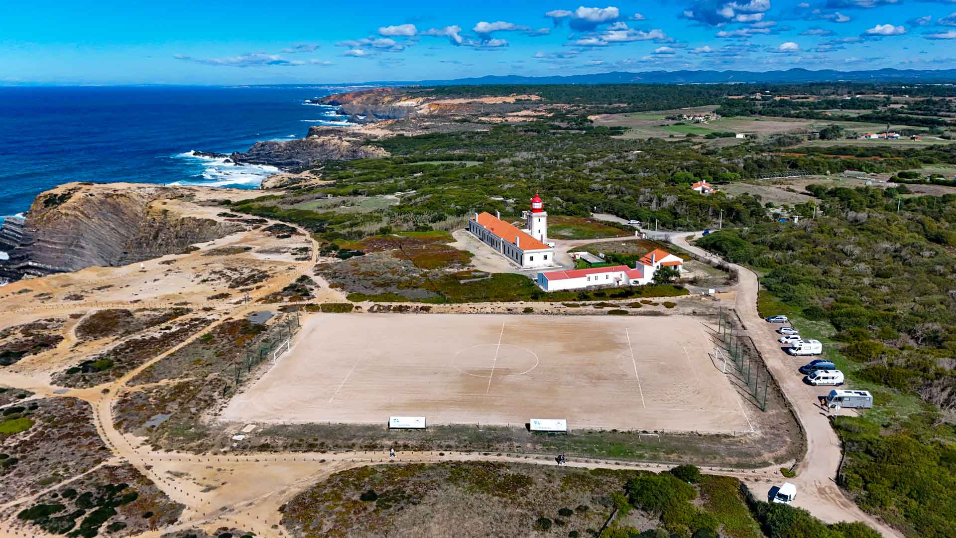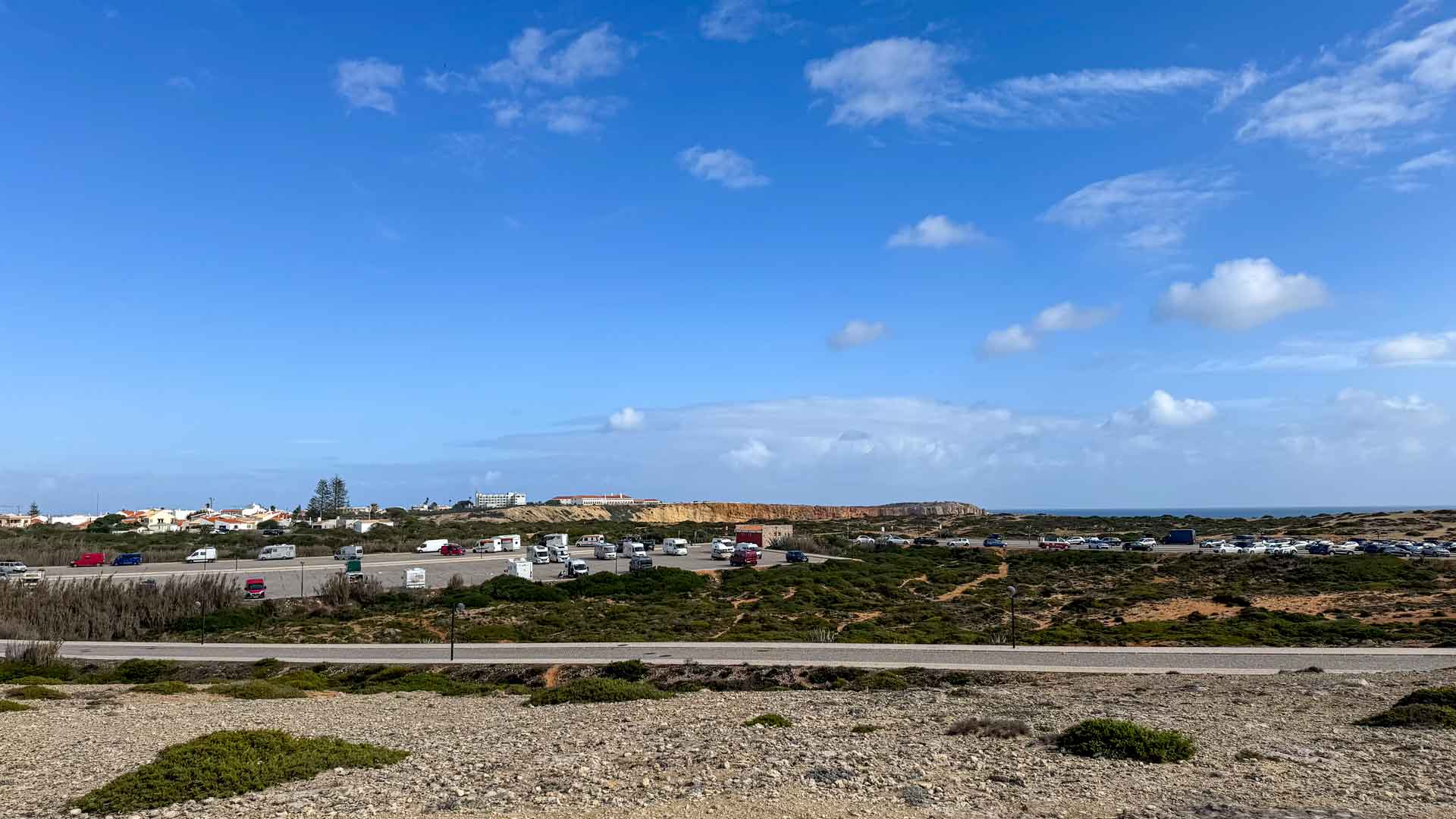 Na ons Zuid Afrikaans avontuur tussen de zebra’s en struisvogels rijden we verder naar Farol Cabo Sardão. Nog zo’n pareltje aan de kust. Als we door het dorpje rijden zien we dat daar al veel auto’s en ook wat campers geparkeerd staan. Hmm en het is nog best een eindje. Gelukkig zien we dan ook dat er een marktje aan de gang is dus daar zullen die geparkeerde auto’s dan wel voor zijn.