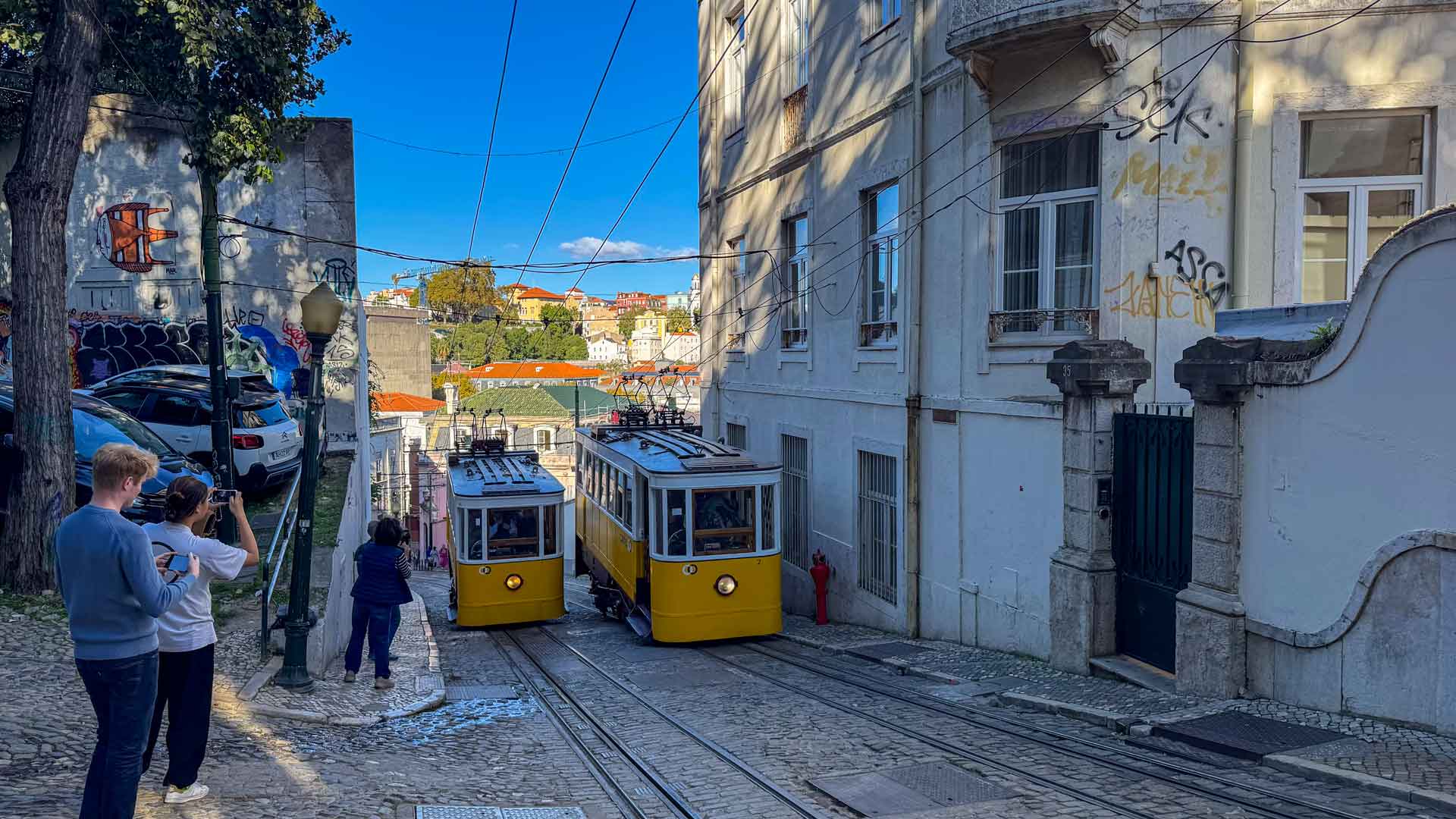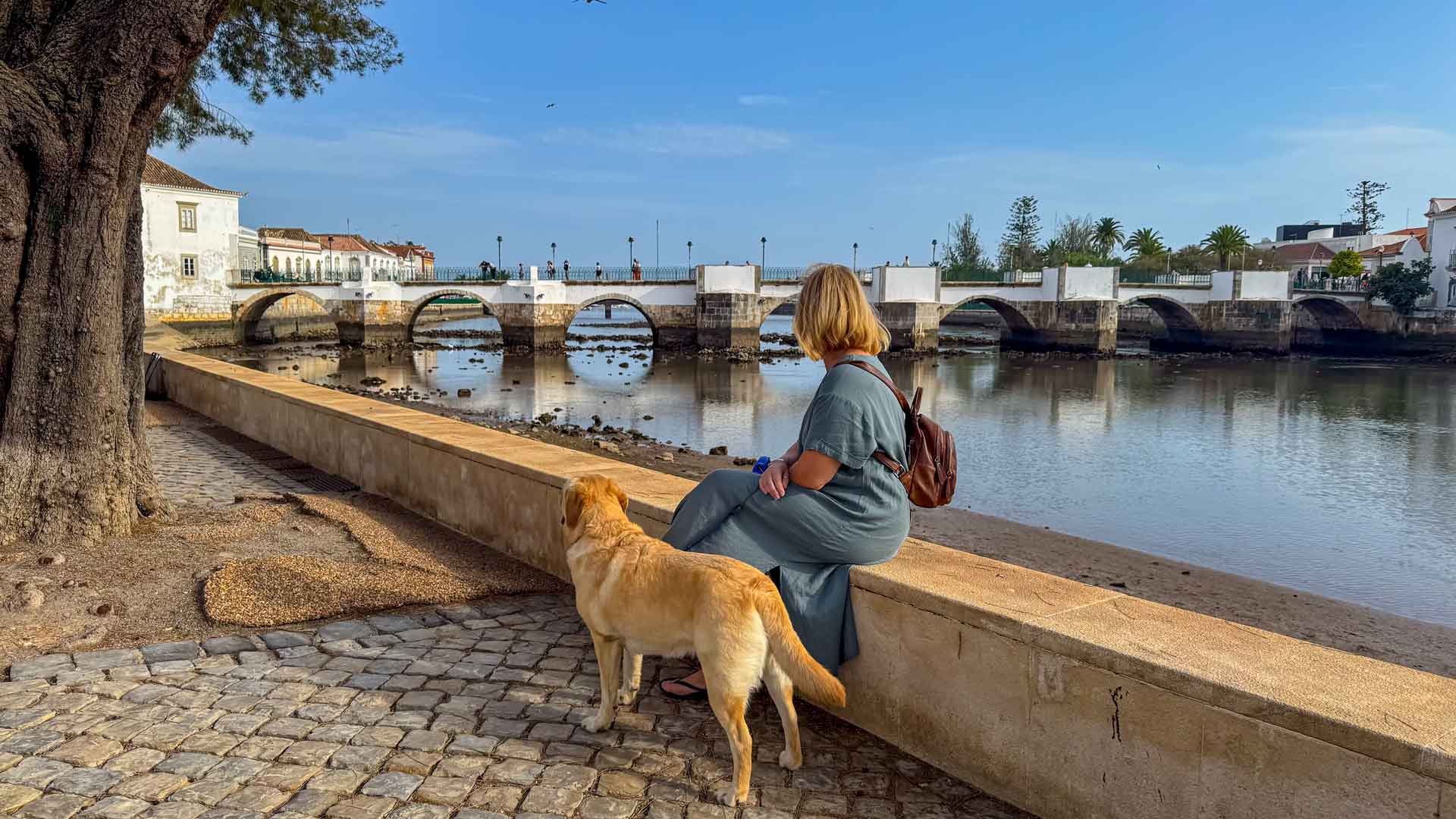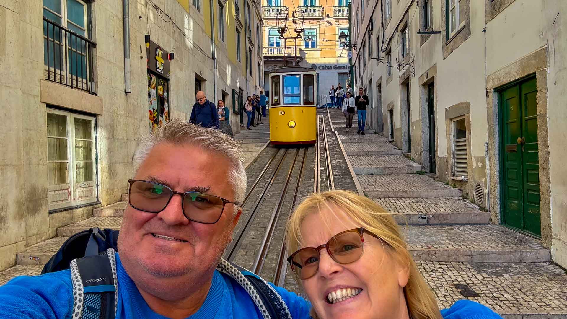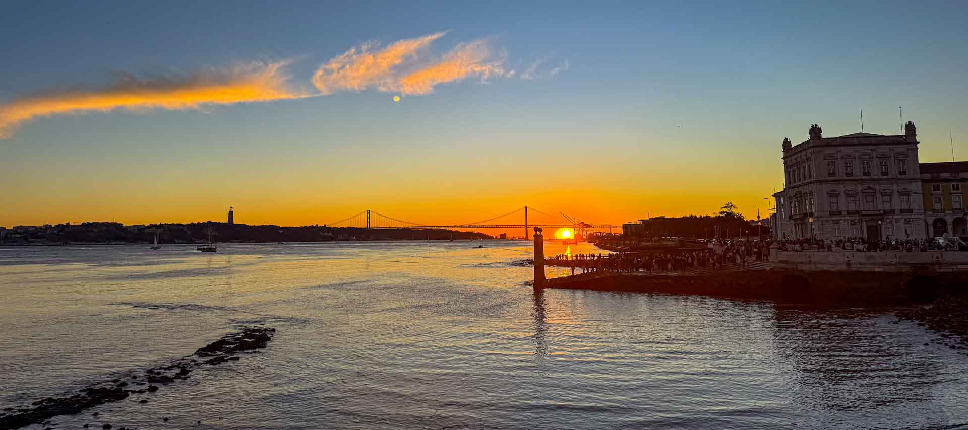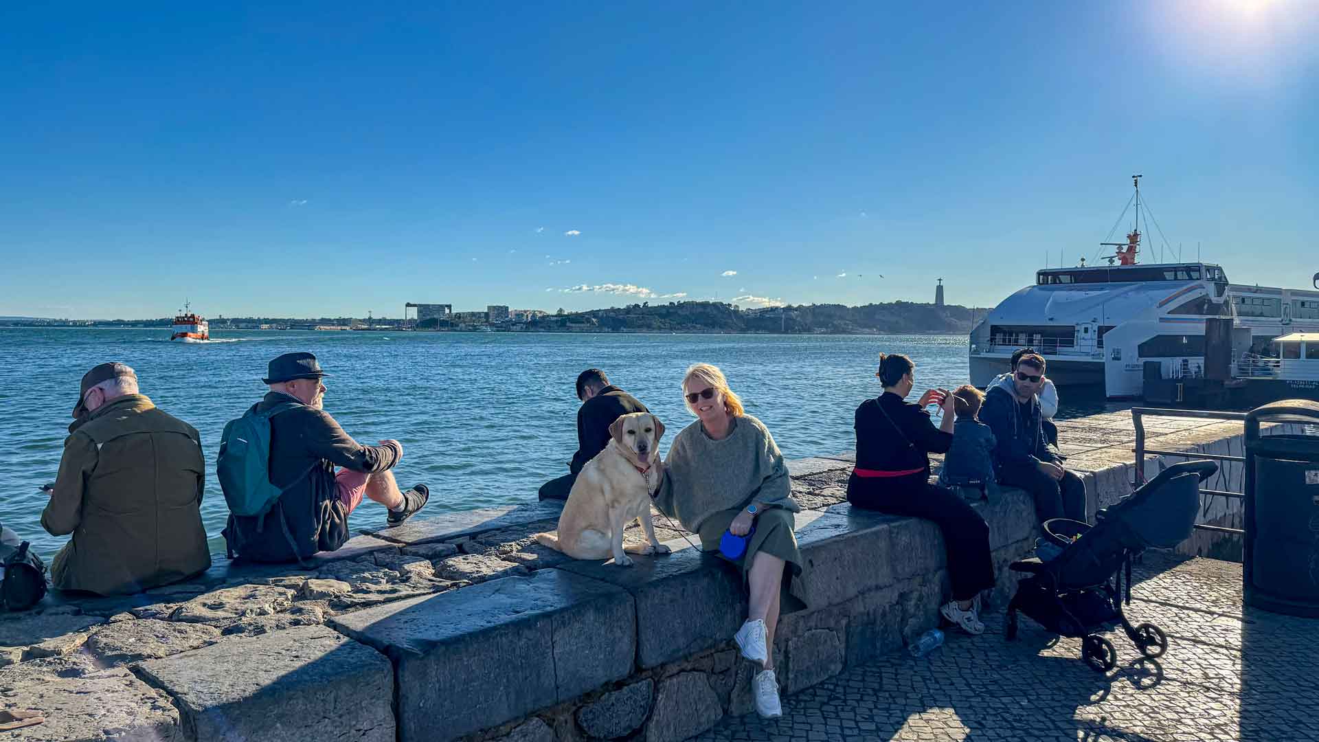 Na het eten zien we de zonsondergang van af de kade achter de beroemde brug, Ponte 25 de Abril. Dit overigens met honderden mensen waarvan een aantal toch ook even moeten knuffelen met ons Stella. Zodra de zon onder is wandelen we nog door de vele leuke straatjes en over de mooie pleinen in de stad.