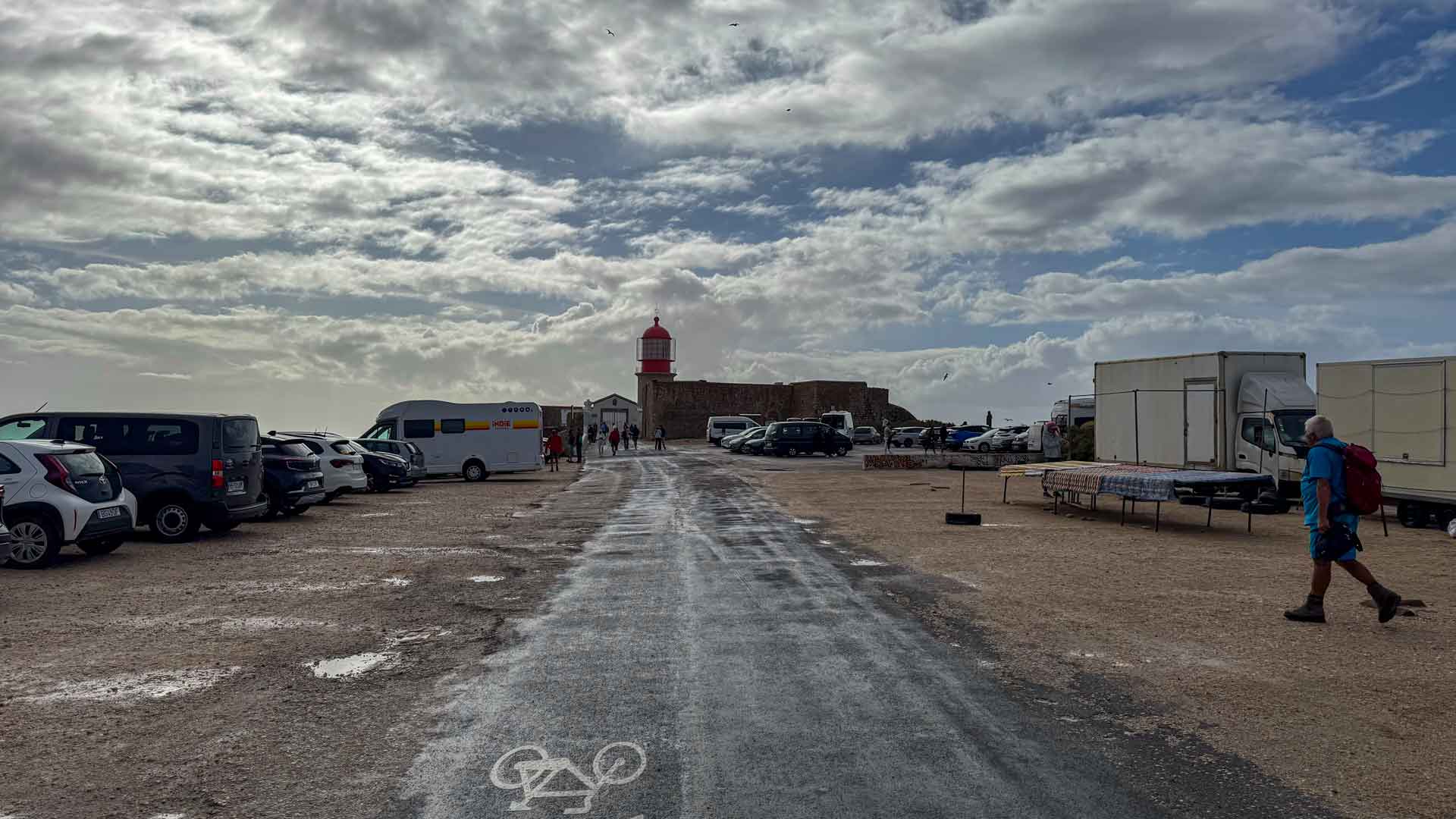 Het weer is weer opgeklaard en we zien de vuurtoren van Cabo de São Vicente weer zien. We besluiten dan ook om die te gaan bezoeken. Na een tocht van zo’n 7 kilometer parkeren we vlak bij de vuurtoren. Maar zodra we willen uitstappen missen we iets, het trapje wat we nog maar net gekocht hadden hebben we laten staan bij de parking van het fort. Hier bij de vuurtoren blijkt toch minder te doen dan bij het fort en de toren zelf is ook afgesloten. Na een rondje gewandeld te hebben gaan we dan ook weer terug naar de camper.