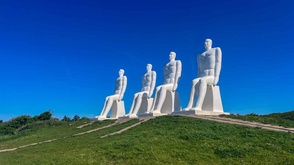 Na het gewoonlijk ochtendritueel, wassen ontbijten en opruimen, vertrekken we bij de boerderij. Op naar Esbjerg. Bij Esbjerg staan de Mennesket ved Havet of te wel Men at Sea, de grote witte mannen die al zittend over de zee kijken.